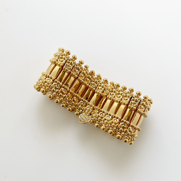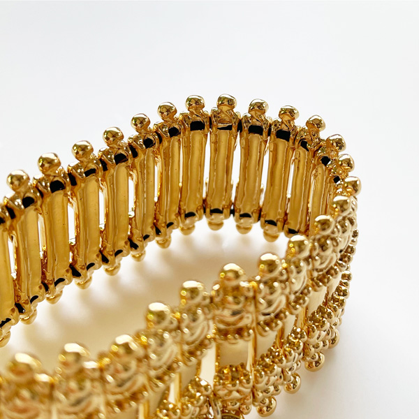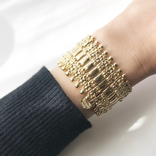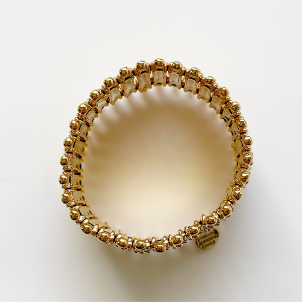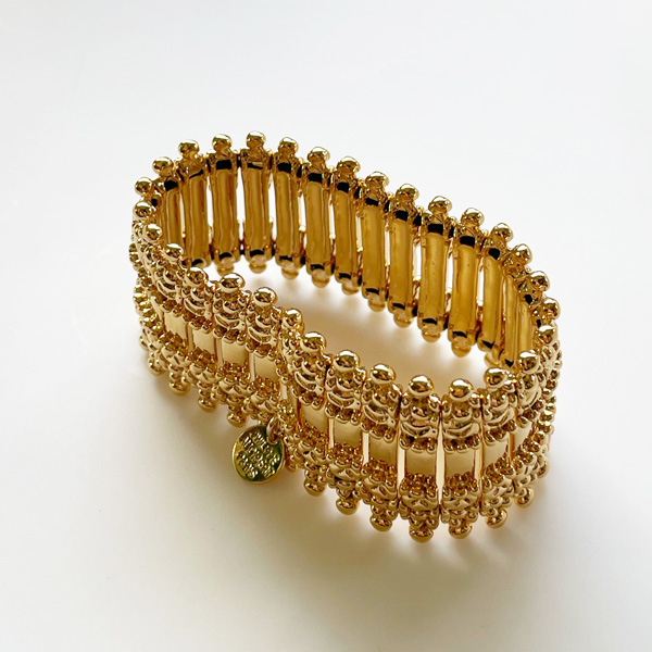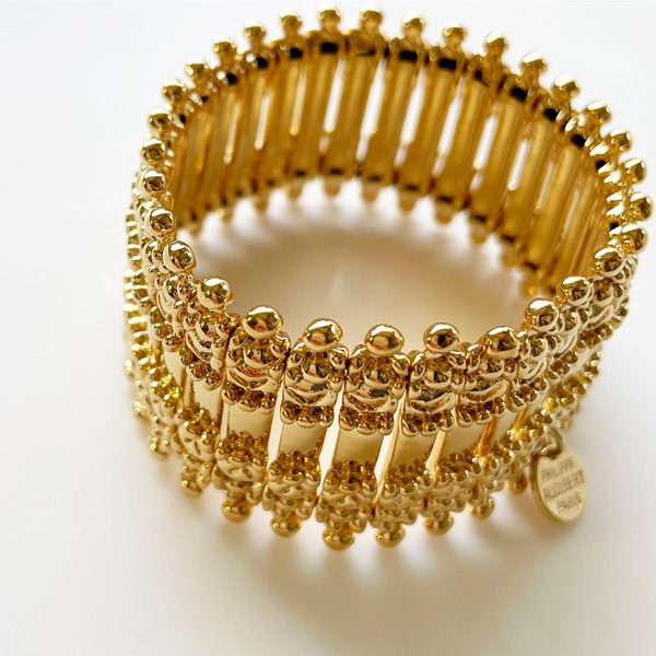 PHILIPPE AUDIBERT『Verona』のライトゴールドが初入荷しました! 『Verona』は幅広バングルでも薄く作られた上品な仕上がりが大人気です! 普段使いからパーティーまで、あらゆる場面で使えます。 これだけリッチ感がありながら、薄く仕上げてあることで品があり、 ゴム仕様のバングルなので、気軽に使えるところも魅力です。 1つでつけたり重ねてつけたり、楽しみ方も色々です。 ●サイズ *全長/185mm(外側) *幅/32mm *重さ/65g ●素材/Pewter ●色/Light Gold MA6040 ※fabCoutureはPHILIPPE AUDIBERTの正規販売店です。 安心してお求めください。