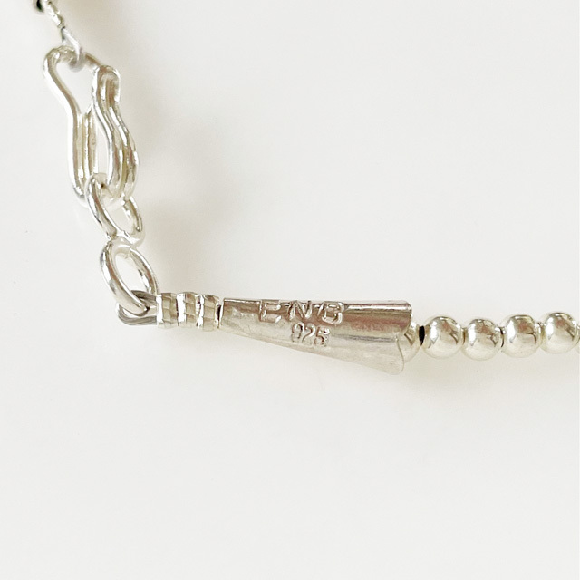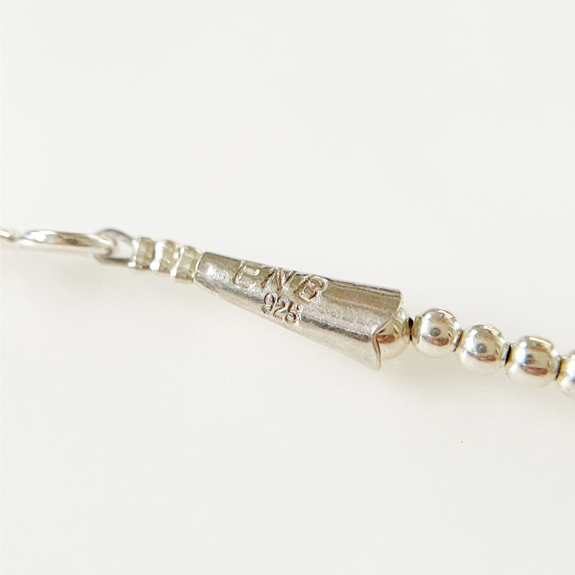 ナバホ族の新進気鋭アーティスト『ERICKA NICOLAS BEGAY/エリッカニコラスビゲイ』のインディアンジュエリーが入荷しました。 シルバーを溶かすところから全て手作業で行うという拘りを持つERICKA NICOLAS BEGAYのナバホパールネックレスは、 中を空洞にする手法で仕上げたナバホパールを使用しているのでとても軽量な作りです。 ブランド名の刻印も一点一点違うほど、ハンドメイドに徹底的に拘っているブランドです。 ※当店はERICKA NICOLAS BEGAY正規販売店です。安心してお買い求め下さい。 ●サイズ/80cm *ボール/約0.3cm *重さ/14.0g ●素材/Sterling Silver ●色/Silver ※ハンドメイドのため、サイズの誤差や多少のキズなどはご容赦下さい。